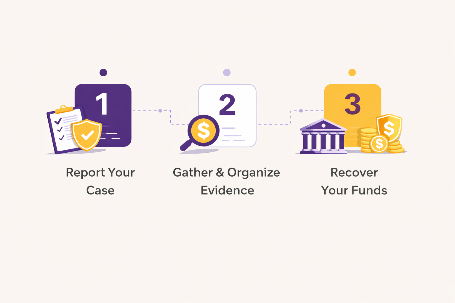 We streamline the process of recovery by focusing on simplicity and clarity. You provide the details, we guide you step-by-step with the proper evidence and actions, and you stay updated throughout the entire process.